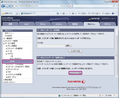 3. [サービス設定]>[ファクス]>[宛先表]を選び、[データのエクスポート(一括取り出し)]の[エクスポートする]をクリックします。