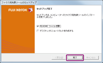 • READMEファイルを自動で開きたくない場合は、[READMEファイルを開く]のチェックを外してから[完了]をクリックしてください。