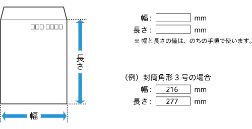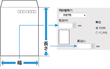 洋封筒の場合は[短辺]に長さを、[長辺]に幅を入力します。