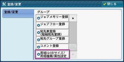 補足- [登録/変更]に、[用紙トレイのサイズ/用紙種類/属性設定]が表示されない場合は、機械管理者により設定変更が制限されています。機械管理者にご相談ください。