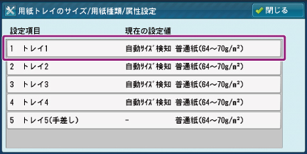 [設定項目]で、用紙種類を変更する用紙トレイを選びます(ここでは[トレイ1]を選びます)。