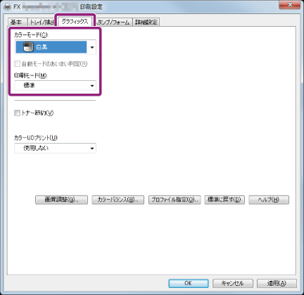 [グラフィックス]タブを開き、[カラーモード]を[白黒]に、[印刷モード]を[標準]に設定します。