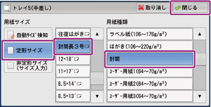 また、工場出荷時は[トレイ5(手差し)]画面の[定形サイズ]で選べる用紙サイズは、長形3号だけです。よく使うサイズがある場合は、表示する用紙サイズを機械管理者によりあらかじめ設定することで、定形サイズで選ぶことができます。