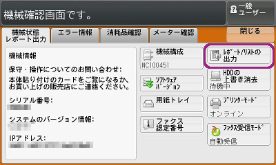 機械確認ボタンを押し、[レポート/リストの出力]を選択します。