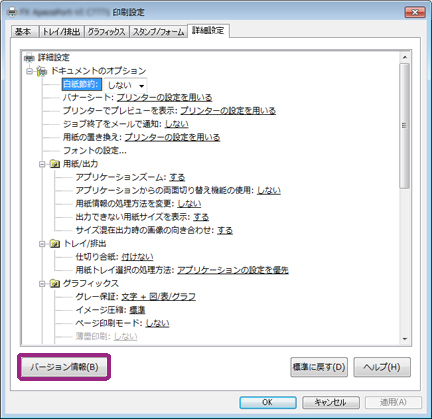 使用しているプリンタードライバーのバージョンを確認できます。出力した機能設定リストと比較し、