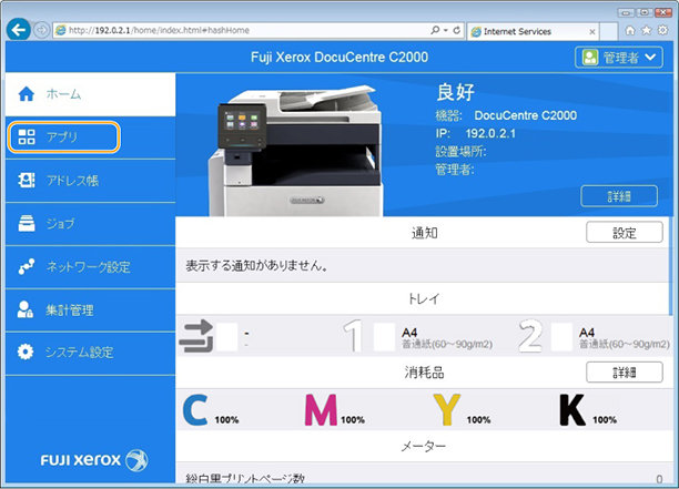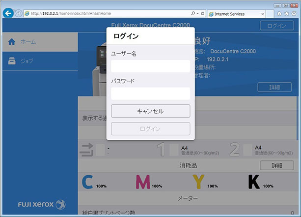 本機のIPアドレスをWebブラウザーに入力して、CentreWare Internet Servicesを起動します。