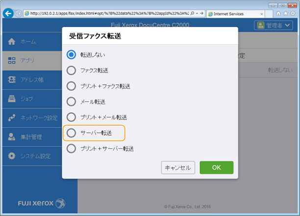 [受信ファクス転送]をクリックします。