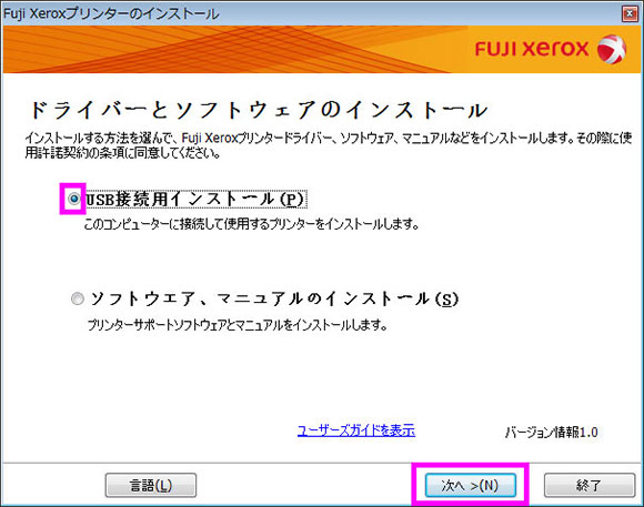 [USB接続用インストール]を選択して[次へ]をクリックします。