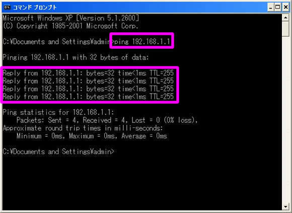 - 「Reply from xxxx.xxxx.xxxx.xxxx」と表示された場合、通信相手から応答があったことを示します。