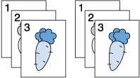 ソート/スタック | コピー出力をソートすることができます。例えば、これらの3ページの原稿を2部コピーする場合、3ページの完全な原稿が印刷されたあとに2部目が印刷されます。  【補足】 - 大量の文書をコピーすると、メモリーの容量を使い切ってしまう場合があります。メモリー不足が発生した場合は、操作パネルで[ソート(1部毎)]を[スタック(ページ毎)]にしてソートを中止してください。