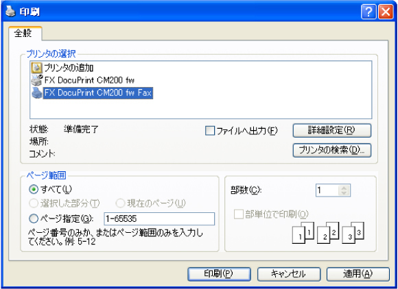 アプリケーションから印刷ダイアログボックスを開き、ファクスドライバーを選択します。