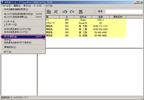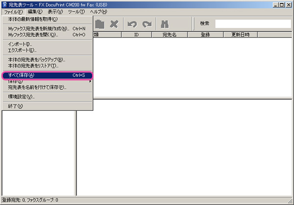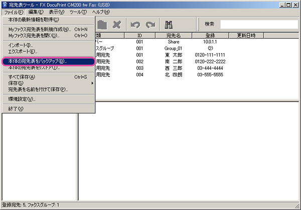 - 「ファイル」から「本体の宛先表をバックアップ」を選択します。