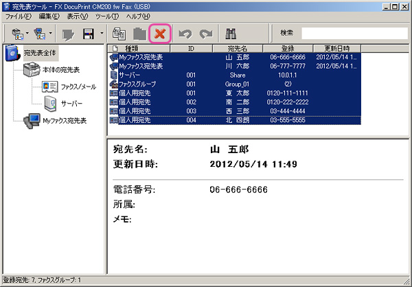 - 「宛先表全体」を表示させ、すべてのファイルを選択し「×」をクリックし削除します。