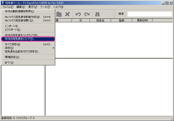- 「ファイル」から「本体の宛先表をリストア」を選択します。