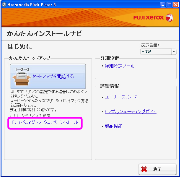 [ドライバおよびソフトウェアのインストール]をクリックします。