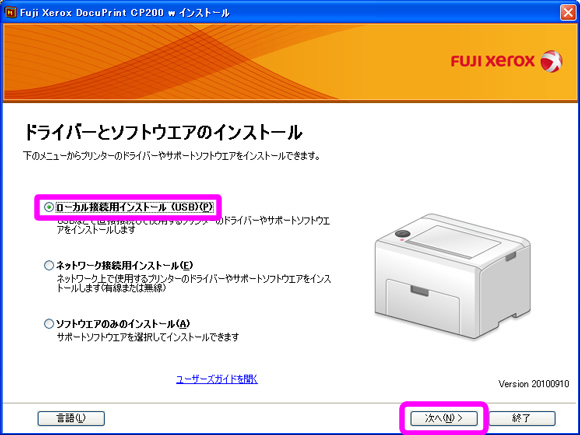 [ローカル接続用インストール (USB)]を選択して[次へ]をクリックします。