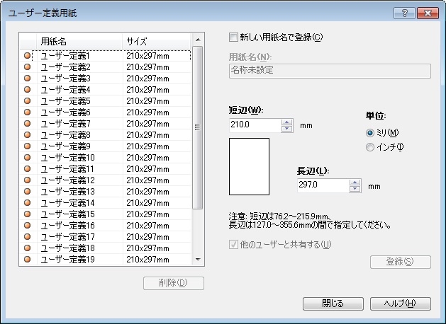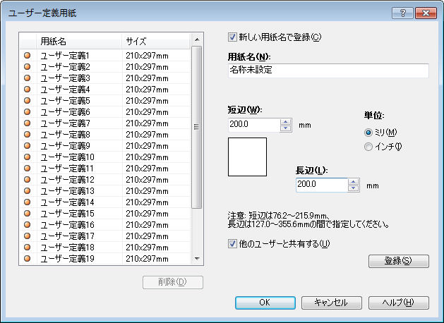 7. 用紙に名前を付ける場合は、[新しい用紙名で登録]にチェックマークを付け、[用紙名]に名前を入力します。