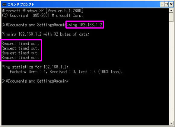 - 「Request timed out .」と表示された場合、通信相手から応答がないことを示します。
