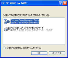 パソコンの画面に以下のダイアログボックスが表示された場合は、[Express Scan Manager-Btype]を選択して[OK]をクリックしてください。[Express Scan Manager-Btype]を選択する際に[この動作には常にこのプログラムを使う]チェックボックスを選択すると、以後はプログラム選択ウィンドウが表示されずに選択したアプリケーションが自動的に使用されるようになります。