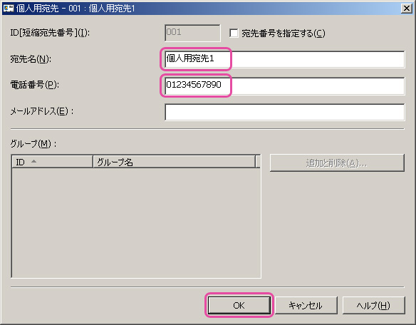 - 『個人用宛先』が開きますので『宛先名』、『電話番号』を入力し『OK』をクリックして作成します。