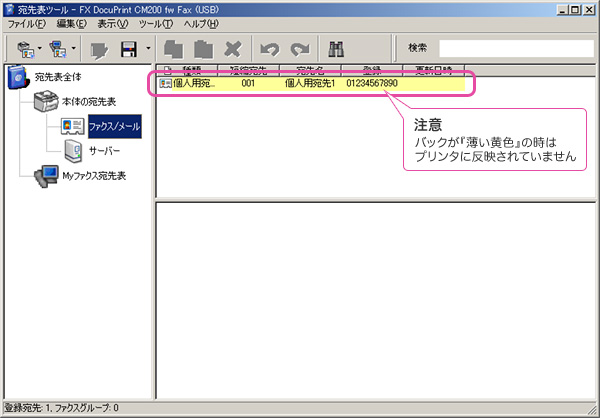 - 次の状態では作成した『個人用宛先』が表示されますが、まだプリンター本体に反映されていませんので注意してください。