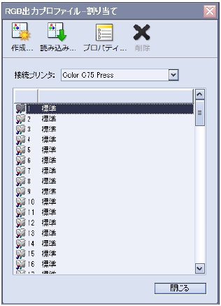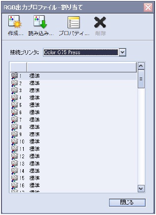 [RGB出力プロファイル-割り当て]ダイアログボックスで、変更するプロファイルを選択し、[プロパティ]をクリックします。