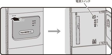 本体装置、Print Serverの順に電源を入れます。電源スイッチを入れてから、5分ほどでコピー、またはプリントできる状態になります。機械の構成によっては5分以上かかることがあります。