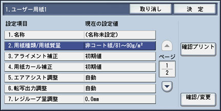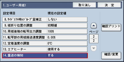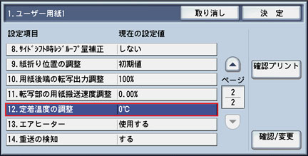 使用する[ユーザー用紙]の設定画面で、[12. 定着温度の調整]を選択し、[確認/変更]ボタンを押します。