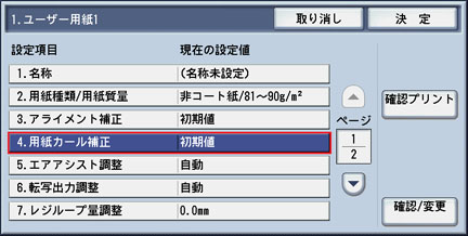 使用する[ユーザー用紙]の設定画面で、[4.用紙カール補正]を選択し、[確認/変更]ボタンを押します。