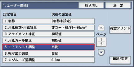 使用する[ユーザー用紙]の設定画面で、[5.エアアシスト調整]を選択し、[確認/変更]ボタンを押します。
