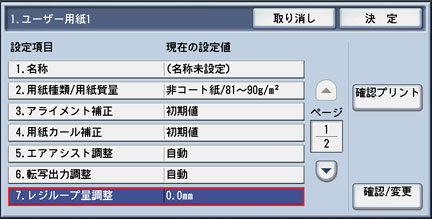 使用する[ユーザー用紙]の設定画面で、[7.レジループ調整]を選択し、[確認/変更]ボタンを押します。