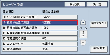 [9.紙折り位置調整]を選択して、[確認/変更]ボタンを押します。