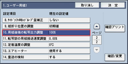 使用する[ユーザー用紙]の設定画面で、[10.用紙後端の転写出力調整]を選択し、[確認/変更]ボタンを押します。
