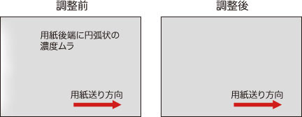 用紙後端の転写出力調整の値を下げすぎると、高像密度のベタ画像で用紙後端に転写不良が発生する場合があります。