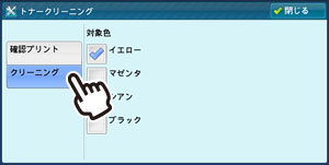 プリント結果を確認し、清掃が必要なトナーにチェックマークを付け、[クリーニング]を押します。