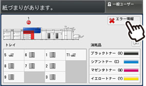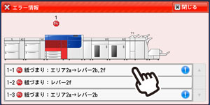 タッチパネルディスプレイのエラー表示エリアでは、紙づまりの該当箇所が赤くなり、メッセージが表示されます。