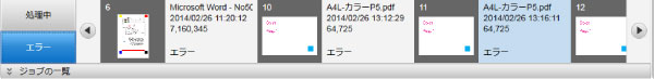 エラージョブの情報(サムネイル、ジョブ名、受信開始日時、ファイルサイズ)を確認できます。