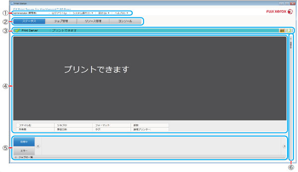 ログインしているユーザー(ログインレベル)とPrint Stationのメニュー(リンクメニュー)が表示されます。リンクメニューからは、Print Serverのシステム全般にかかわる操作ができます。