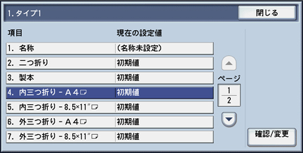 設定または調整したい紙折り位置タイプを選択して、[確認/変更]を押します。