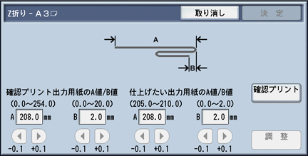 二つ折り、製本、内三つ折り、外三つ折り、Z折りの折り位置が調整できます。