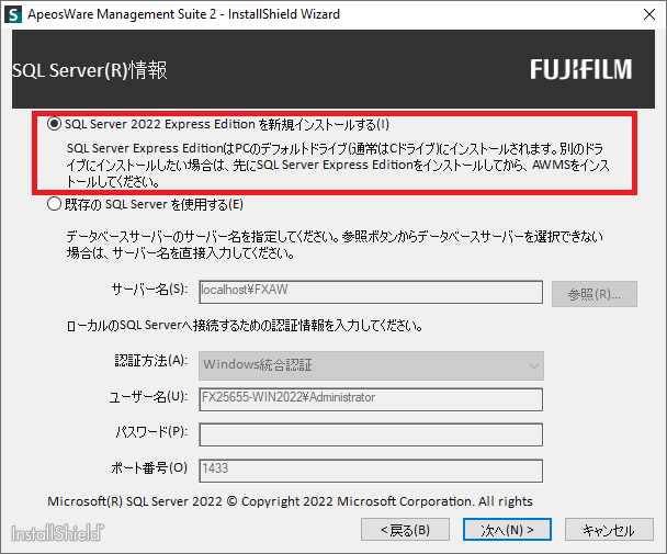 SQL Server 2022 Express EditionをApeosWare Management Suite 2の既定のインストールパラメーターでご利用いただく場合は、以下の手順を実施してください。SQL Server 2022 Express EditionはApeosWare Management Suite 2のインストール時にインストールすることができます。