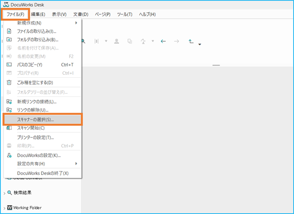 - DocuWorks Desk画面上部の[ファイル]メニュー>[スキャナーの選択]をクリックします。