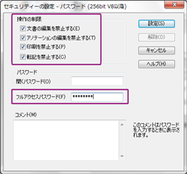 - 開いたダイアログボックスの[操作の制限]から全ての項目にチェックをいれます。[開くパスワード]を入力せず、[フルアクセスパスワード]のみを入力(必須)して、<設定>をクリックします。