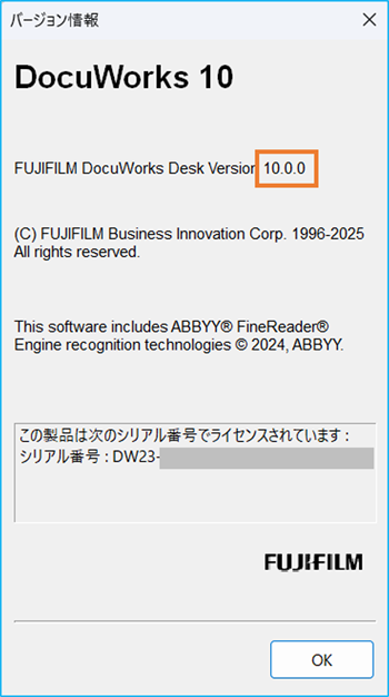 - インストールされているDocuWorksの下の行に記載されている詳細バージョンを確認する