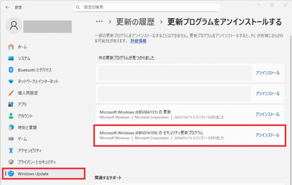 ※ ”関連設定”は画面下の方に表示されることがあります。見つからない場合には、下の方にスクロールしてください。 - 「Microsoft Windows (KB5074109) のセキュリティ更新プログラム」の「アンインストール」をクリックして、アンインストールしてから、端末を再起動します。