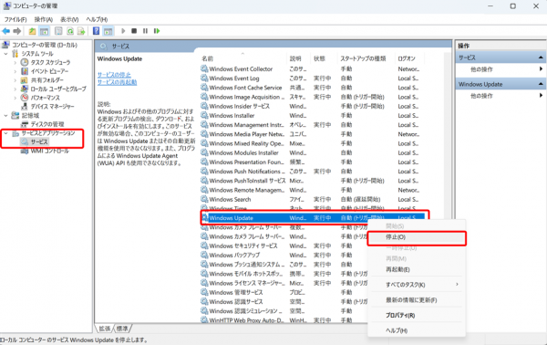- ・「サービスとアプリケーション」>「サービス」を開き、「Windows Update」を右クリック>「停止」をクリックします。