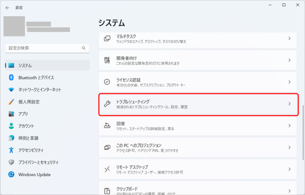 - 1)「スタート」>「設定」>「システム」>「トラブルシューティング」を選択します。