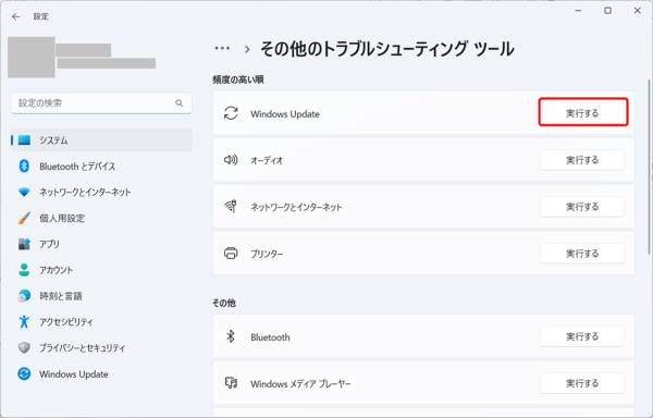 - 3)「その他のトラブルシューティング」をクリックし、「Windows Update」の「実行する」をクリックします。
