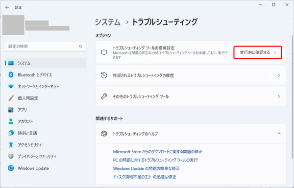 - 2)「トラブルシューティングツールの推奨設定を「実行前に確認する」にします。