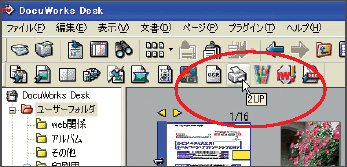 プラグインを利用すれば、ボタン1つで2UP/1UPを選ぶことができます。注記;DocuWorks 6で説明しています。他のバージョンでは、画面が違ったり使えない機能があるのでご注意願います。